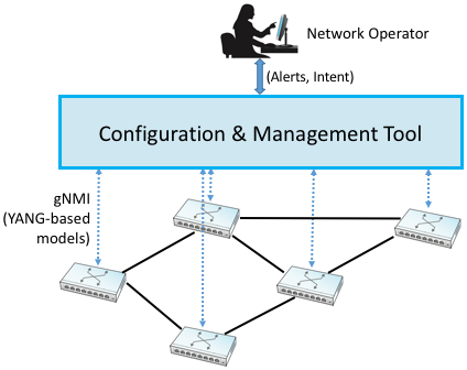 Figure 234. Operator manages a network through a configuration and management tool, which in turn programmatically interacts with the underlying network devices (e.g., using gNMI as the transport protocol and YANG to specify the schema for the data being exchanged).#