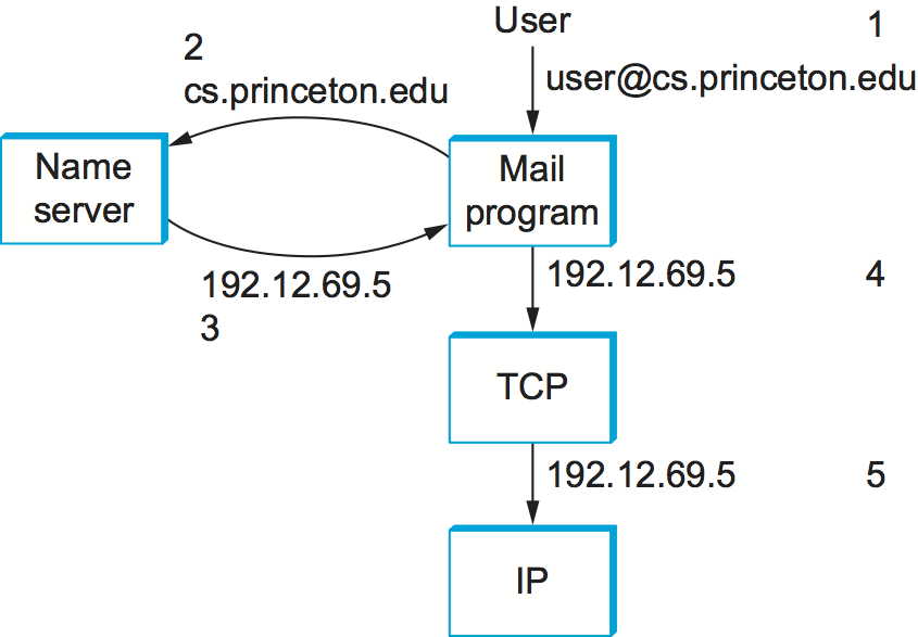 What happens in the Internet is that a user presents a host name to an application program (possibly embedded in a compound name such as an email address or URL), and this program engages the naming system to translate this name into a host address. The application then opens a connection to this host by presenting some transport protocol (e.g., TCP) with the host’s IP address. This situation is illustrated (in the case of sending email) in Figure 229. While this picture makes the name resolution task look simple enough, there is a bit more to it, as we shall see.