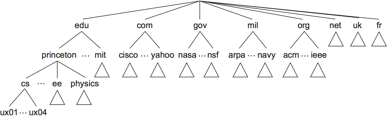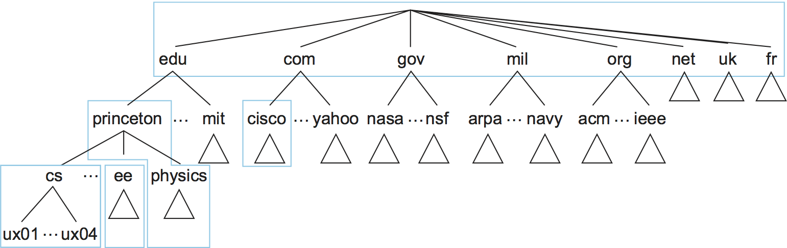 Like the Unix file hierarchy, the DNS hierarchy can be visualized as a tree, where each node in the tree corresponds to a domain, and the leaves in the tree correspond to the hosts being named. Figure 230 gives an example of a domain hierarchy. Note that we should not assign any semantics to the term domain other than that it is simply a context in which additional names can be defined.2