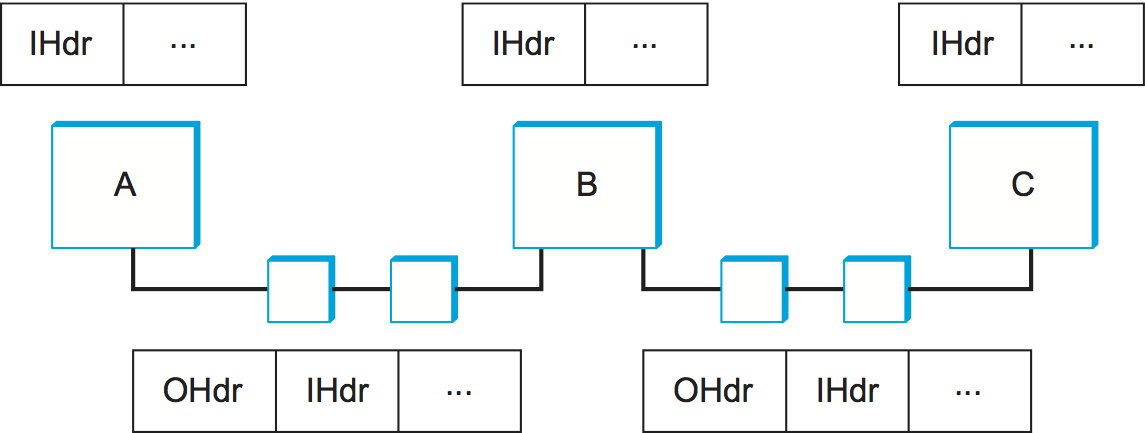 routers understand only the outer header. Similarly, A, B, and C have