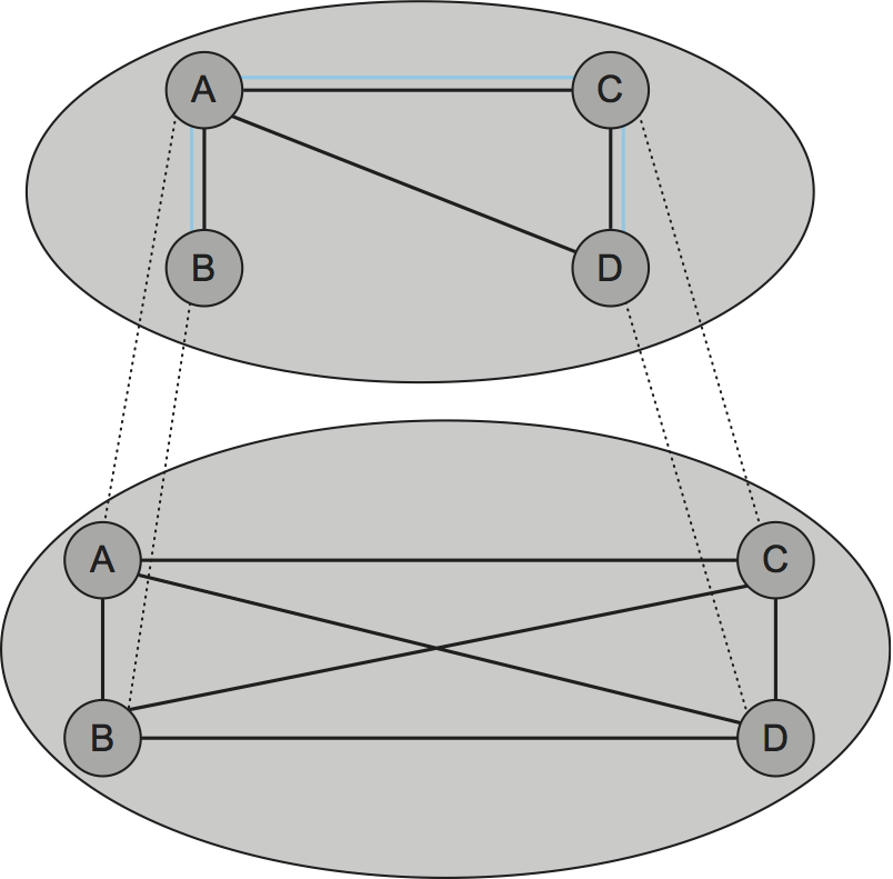 The general approach is to support multiple levels of overlay networks, each of which extracts a subgraph from the overlay below it, until we have selected the subgraph that the application expects. For end system multicast, in particular, this happens in two stages: First we construct a simple mesh overlay on top of the fully connected Internet, and then we select a multicast tree within this mesh. The idea is illustrated in Figure 238, again assuming the four end hosts A, B, C, and D. The first step is the critical one: Once we have selected a suitable mesh overlay, we simply run a standard multicast routing algorithm (e.g., DVMRP) on top of it to build the multicast tree. We also have the luxury of ignoring the scalability issue that Internet-wide multicast faces since the intermediate mesh can be selected to include only those nodes that want to participate in a particular multicast group.