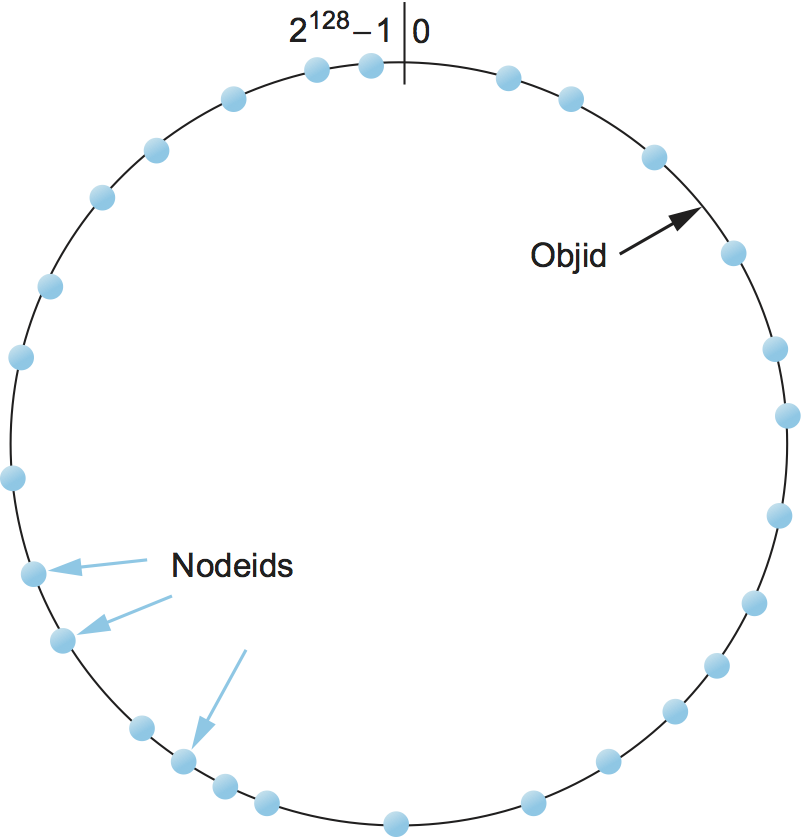 Figure 241. Both nodes and objects map (hash) onto the ID space, where objects are maintained at the nearest node in this space.#