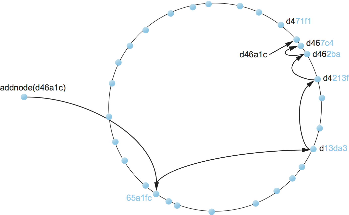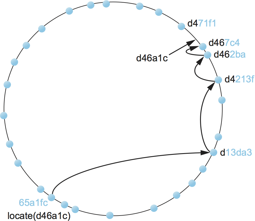 We now turn to the second question—how does a user that wants to access object x know which node is closest in x’s ID in this space? One possible answer is that each node keeps a complete table of node IDs and their associated IP addresses, but this would not be practical for a large network. The alternative, which is the approach used by structured peer-to-peer networks, is to route a message to this node! In other words, if we construct the overlay in a clever way—which is the same as saying that we need to choose entries for a node’s routing table in a clever way—then we find a node simply by routing toward it. Collectively, this approach is sometimes called a distributed hash table (DHT), since conceptually, the hash table is distributed over all the nodes in the network.