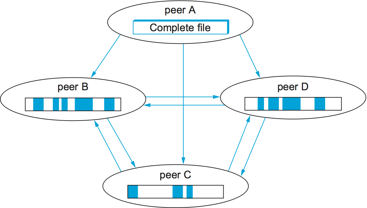 Each file is shared via its own independent BitTorrent network, called a swarm. (A swarm could potentially share a set of files, but we describe the single file case for simplicity.) The lifecycle of a typical swarm is as follows. The swarm starts as a singleton peer with a complete copy of the file. A node that wants to download the file joins the swarm, becoming its second member, and begins downloading pieces of the file from the original peer. In doing so, it becomes another source for the pieces it has downloaded, even if it has not yet downloaded the entire file. (In fact, it is common for peers to leave the swarm once they have completed their downloads, although they are encouraged to stay longer.) Other nodes join the swarm and begin downloading pieces from multiple peers, not just the original peer. See Figure 245.
