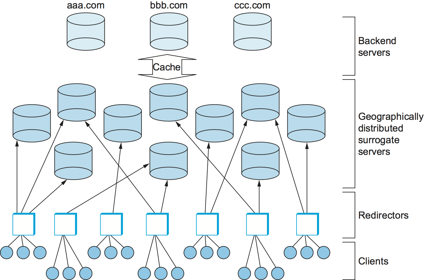 Having a large set of geographically distributed servers does not fully solve the problem. To complete the picture, CDNs also need to provide a set of redirectors that forward client requests to the most appropriate server, as shown in Figure 246. The primary objective of the redirectors is to select the server for each request that results in the best response time for the client. A secondary objective is for the system as a whole to process as many requests per second as the underlying hardware (network links and web servers) is able to support. The average number of requests that can be satisfied in a given time period—known as the system throughput—is primarily an issue when the system is under heavy load, such as when a flash crowd is accessing a small set of pages or a Distributed Denial of Service (DDoS) attacker is targeting a particular site, as happened to CNN, Yahoo, and several other high-profile sites in February 2000.