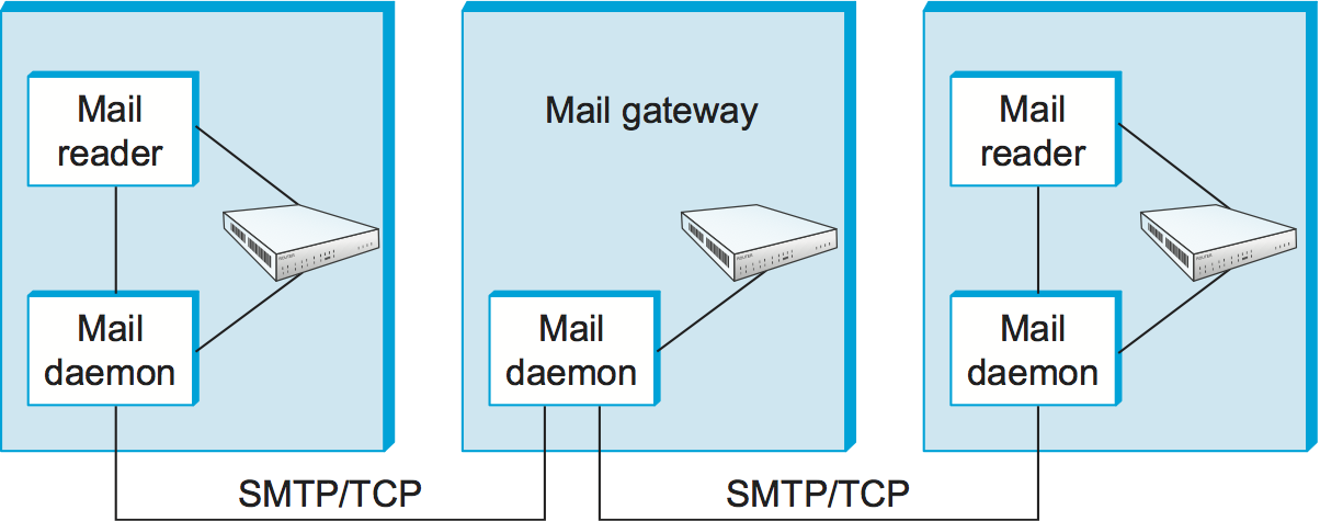 To place SMTP in the right context, we need to identify the key players. First, users interact with a mail reader when they compose, file, search, and read their email. Countless mail readers are available, just like there are many web browsers to choose from. In the early days of the Internet, users typically logged into the machine on which their mailbox resided, and the mail reader they invoked was a local application program that extracted messages from the file system. Today, of course, users remotely access their mailbox from their laptop or smartphone; they do not first log into the host that stores their mail (a mail server). A second mail transfer protocol, such as POP or IMAP, is used to remotely download email from a mail server to the user’s device.