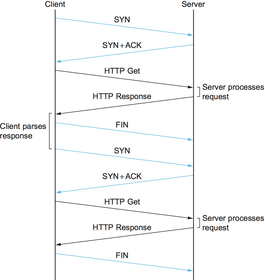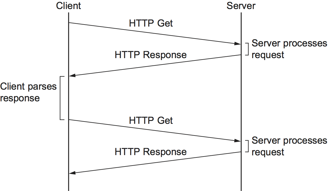 Finally, since the application protocols described in this section follow the same request/reply communication pattern, you might expect that they would be built on top of a Remote Procedure Call (RPC) transport protocol. This is not the case, however, as they are instead implemented on top of TCP 1. In effect, each protocol reinvents a simple RPC-like mechanism on top of a reliable transport protocol (TCP). We say “simple” because each protocol is not designed to support arbitrary remote procedure calls of the sort discussed in an earlier chapter, but is instead designed to send and respond to a specific set of request messages. Interestingly, the approach taken by HTTP has proven quite powerful, which has led to it being adopted widely by the Web Services architecture, with general RPC mechanisms built on top of HTTP rather than the other way around. More on this topic at the end of this section.