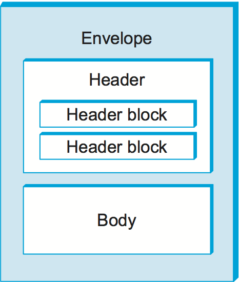 The second and more flexible way to implement features involves header blocks. A SOAP message consists of an Envelope, which contains a Header that contains header blocks, and a Body, which contains the payload destined for the ultimate receiver. This message structure is illustrated in Figure 221.