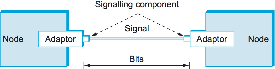 Most of the functions discussed in this chapter are performed by a network adaptor—a piece of hardware that connects a node to a link. The network adaptor contains a signalling component that actually encodes bits into signals at the sending node and decodes signals into bits at the receiving node. Thus, as illustrated in Figure 23, signals travel over a link between two signalling components, and bits flow between network adaptors.