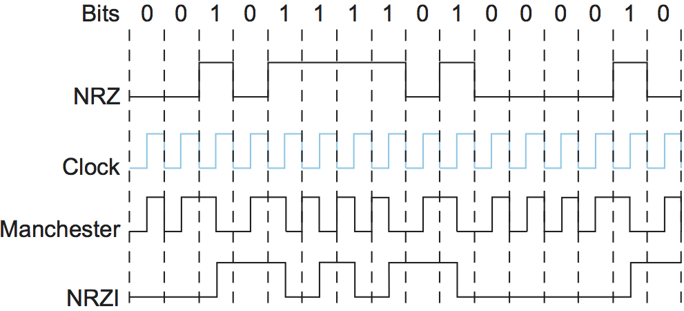 The second problem is that frequent transitions from high to low and vice versa are necessary to enable clock recovery. Intuitively, the clock recovery problem is that both the encoding and decoding processes are driven by a clock—every clock cycle the sender transmits a bit and the receiver recovers a bit. The sender’s and the receiver’s clocks have to be precisely synchronized in order for the receiver to recover the same bits the sender transmits. If the receiver’s clock is even slightly faster or slower than the sender’s clock, then it does not correctly decode the signal. You could imagine sending the clock to the receiver over a separate wire, but this is typically avoided because it makes the cost of cabling twice as high. So, instead, the receiver derives the clock from the received signal—the clock recovery process. Whenever the signal changes, such as on a transition from 1 to 0 or from 0 to 1, then the receiver knows it is at a clock cycle boundary, and it can resynchronize itself. However, a long period of time without such a transition leads to clock drift. Thus, clock recovery depends on having lots of transitions in the signal, no matter what data is being sent.