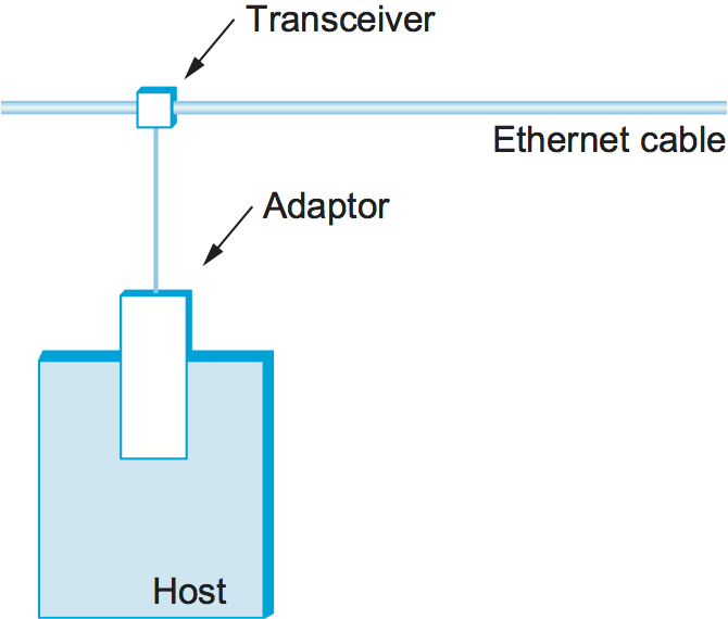 Ethernet segments were originally implemented using coaxial cable of length up to 500 m. (Modern Ethernets use twisted copper pairs, usually a particular type known as “Category 5,” or optical fibers, and in some cases can be quite a lot longer than 500 m.) This cable was similar to the type used for cable TV. Hosts connected to an Ethernet segment by tapping into it. A transceiver, a small device directly attached to the tap, detected when the line was idle and drove the signal when the host was transmitting. It also received incoming signals. The transceiver, in turn, connected to an Ethernet adaptor, which was plugged into the host. This configuration is shown in Figure 39.