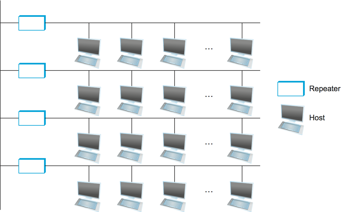 Multiple Ethernet segments can be joined together by repeaters (or a multi-port variant of a repeater, called a hub). A repeater is a device that forwards digital signals, much like an amplifier forwards analog signals; repeaters do not understand bits or frames. No more than four repeaters could be positioned between any pair of hosts, meaning that a classical Ethernet had a total reach of only 2500 m. For example, using just two repeaters between any pair of hosts supports a configuration similar to the one illustrated in Figure 40; that is, a segment running down the spine of a building with a segment on each floor.