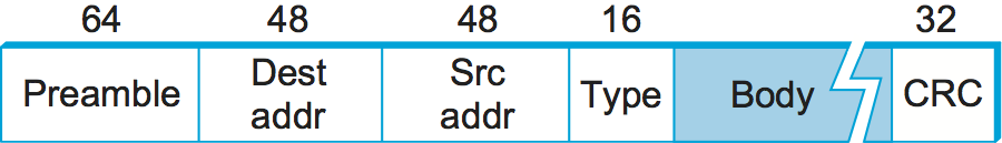 Each Ethernet frame is defined by the format given in Figure 41. The 64-bit preamble allows the receiver to synchronize with the signal; it is a sequence of alternating 0s and 1s. Both the source and destination hosts are identified with a 48-bit address. The packet type field serves as the demultiplexing key; it identifies to which of possibly many higher-level protocols this frame should be delivered. Each frame contains up to 1500 bytes of data. Minimally, a frame must contain at least 46 bytes of data, even if this means the host has to pad the frame before transmitting it. The reason for this minimum frame size is that the frame must be long enough to detect a collision; we discuss this more below. Finally, each frame includes a 32-bit CRC. Like the HDLC protocol described in an earlier section, the Ethernet is a bit-oriented framing protocol. Note that from the host’s perspective, an Ethernet frame has a 14-byte header: two 6-byte addresses and a 2-byte type field. The sending adaptor attaches the preamble and CRC before transmitting, and the receiving adaptor removes them.