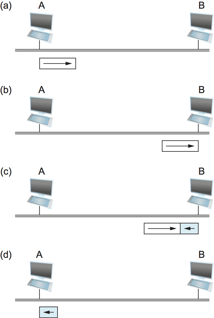 Figure 42. Worst-case scenario: (a) A sends a frame at time t; (b) A’s frame arrives at B at time t+d; (c) B begins transmitting at time t+d and collides with A’s frame; (d) B’s runt (32-bit) frame arrives at A at time t+2×d.#
