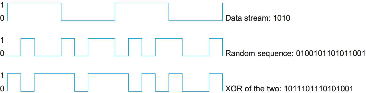 A second spread spectrum technique, called direct sequence, adds redundancy for greater tolerance of interference. Each bit of data is represented by multiple bits in the transmitted signal so that, if some of the transmitted bits are damaged by interference, there is usually enough redundancy to recover the original bit. For each bit the sender wants to transmit, it actually sends the exclusive-OR of that bit and n random bits. As with frequency hopping, the sequence of random bits is generated by a pseudorandom number generator known to both the sender and the receiver. The transmitted values, known as an n-bit chipping code, spread the signal across a frequency band that is n times wider than the frame would have otherwise required. Figure 43 gives an example of a 4-bit chipping sequence.