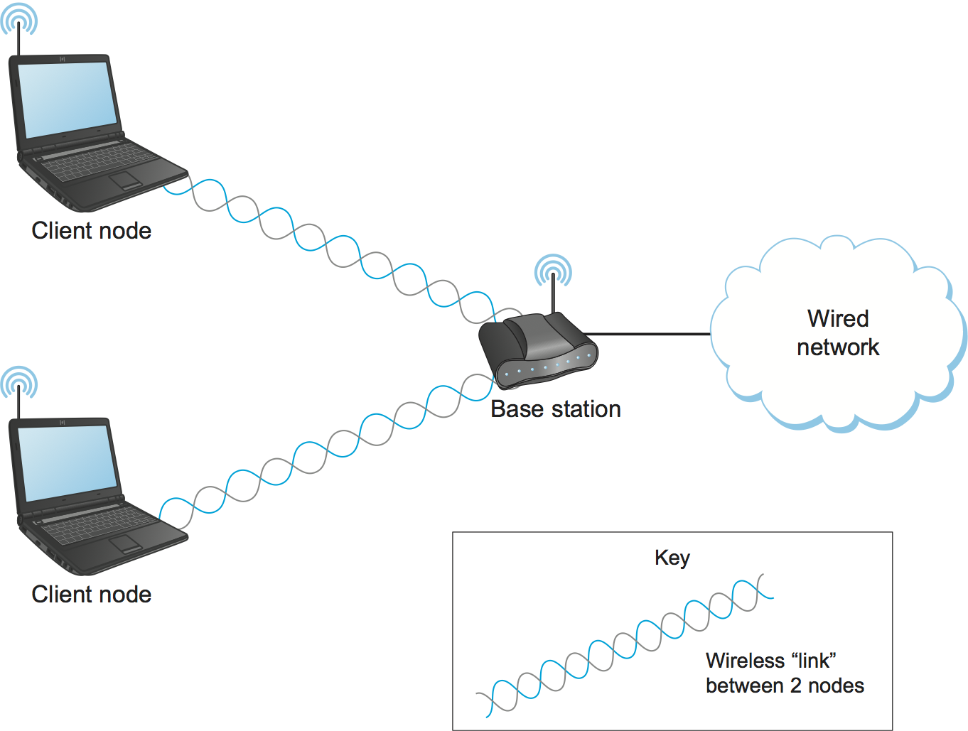 Note that in Figure 44 communication between non-base (client) nodes is routed via the base station. This is in spite of the fact that radio waves emitted by one client node may well be received by other client nodes—the common base station model does not permit direct communication between the client nodes.