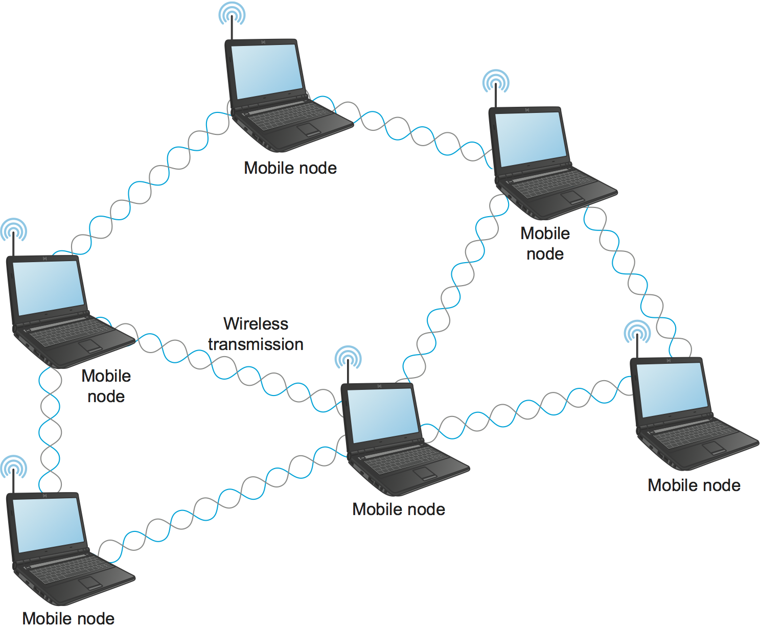 An alternative topology that is seeing increasing interest is the mesh or ad hoc network. In a wireless mesh, nodes are peers; that is, there is no special base station node. Messages may be forwarded via a chain of peer nodes as long as each node is within range of the preceding node. This is illustrated in Figure 45. This allows the wireless portion of a network to extend beyond the limited range of a single radio. From the point of view of competition between technologies, this allows a shorter-range technology to extend its range and potentially compete with a longer-range technology. Meshes also offer fault tolerance by providing multiple routes for a message to get from point A to point B. A mesh network can be extended incrementally, with incremental costs. On the other hand, a mesh network requires non-base nodes to have a certain level of sophistication in their hardware and software, potentially increasing per-unit costs and power consumption, a critical consideration for battery-powered devices. Wireless mesh networks are of considerable research interest, but they are still in their relative infancy compared to networks with base stations. Wireless sensor networks, another hot emerging technology, often form wireless meshes.