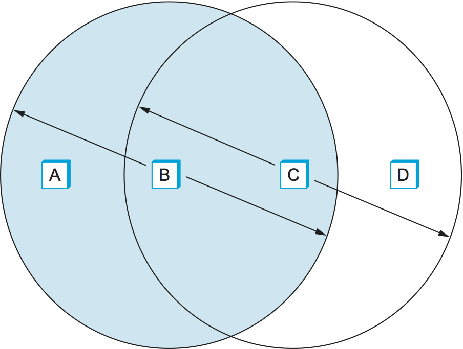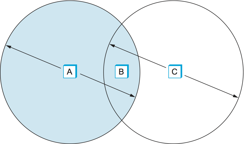 Consider the situation depicted in Figure 46, where A and C are both within range of B but not each other. Suppose both A and C want to communicate with B and so they each send it a frame. A and C are unaware of each other since their signals do not carry that far. These two frames collide with each other at B, but unlike an Ethernet, neither A nor C is aware of this collision. A and C are said to be hidden nodes with respect to each other.