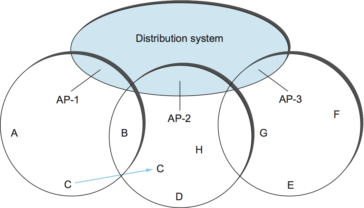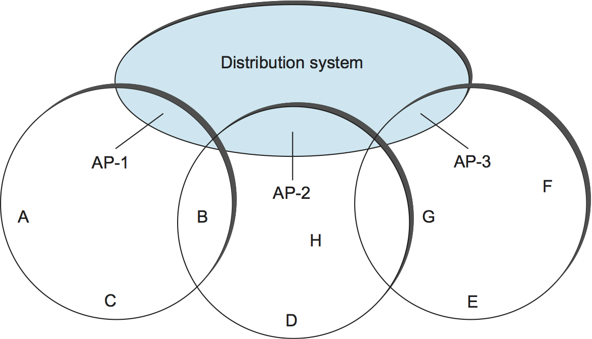 The details of the distribution system are not important to this discussion—it could be an Ethernet, for example. The only important point is that the distribution network operates at the link layer, the same protocol layer as the wireless links. In other words, it does not depend on any higher-level protocols (such as the network layer).