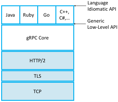 Figure 146. gRPC core stacked on top of HTTP, TLS, and TCP and supporting a collection of languages.#