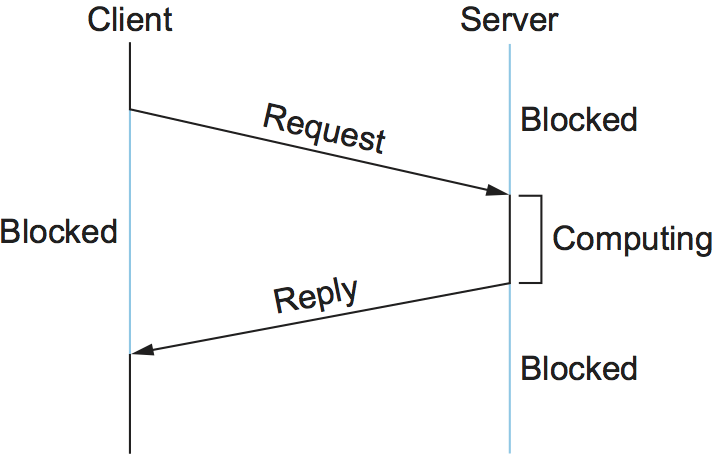 A common pattern of communication used by application programs structured as a client/server pair is the request/reply message transaction: A client sends a request message to a server, and the server responds with a reply message, with the client blocking (suspending execution) to wait for the reply. Figure 137 illustrates the basic interaction between the client and server in such an exchange.