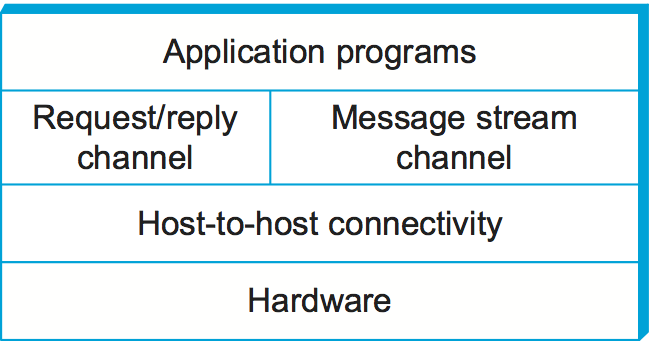 Thinking of a system as a linear sequence of layers is an oversimplification, however. Many times there are multiple abstractions provided at any given level of the system, each providing a different service to the higher layers but building on the same low-level abstractions. To see this, consider the two types of channels discussed in the previous section. One provides a request/reply service and one supports a message stream service. These two channels might be alternative offerings at some level of a multilevel networking system, as illustrated in Figure 9.