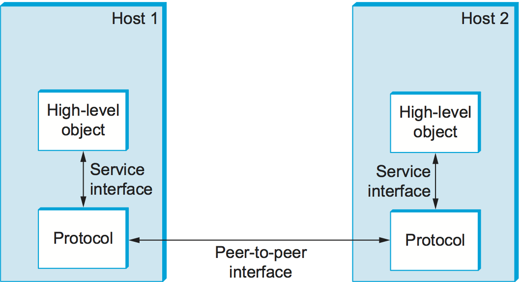 Using this discussion of layering as a foundation, we are now ready to discuss the architecture of a network more precisely. For starters, the abstract objects that make up the layers of a network system are called protocols. That is, a protocol provides a communication service that higher-level objects (such as application processes, or perhaps higher-level protocols) use to exchange messages. For example, we could imagine a network that supports a request/reply protocol and a message stream protocol, corresponding to the request/reply and message stream channels discussed above.