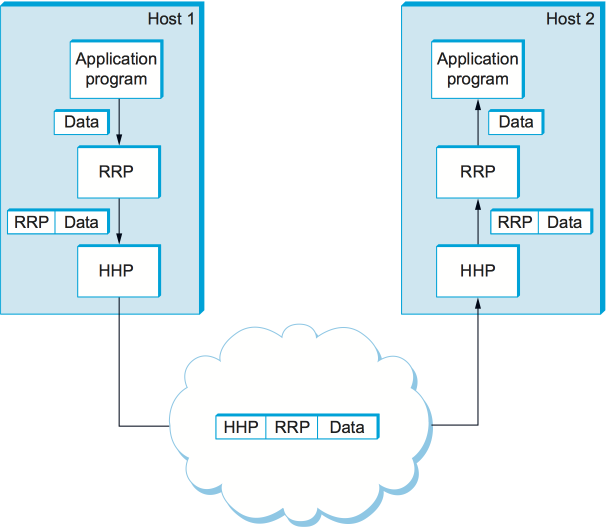 In this example, suppose that the file access program on host 1 wants to send a message to its peer on host 2 using the communication service offered by RRP. In this case, the file application asks RRP to send the message on its behalf. To communicate with its peer, RRP invokes the services of HHP, which in turn transmits the message to its peer on the other machine. Once the message has arrived at the instance of HHP on host 2, HHP passes the message up to RRP, which in turn delivers the message to the file application. In this particular case, the application is said to employ the services of the protocol stack RRP/HHP.