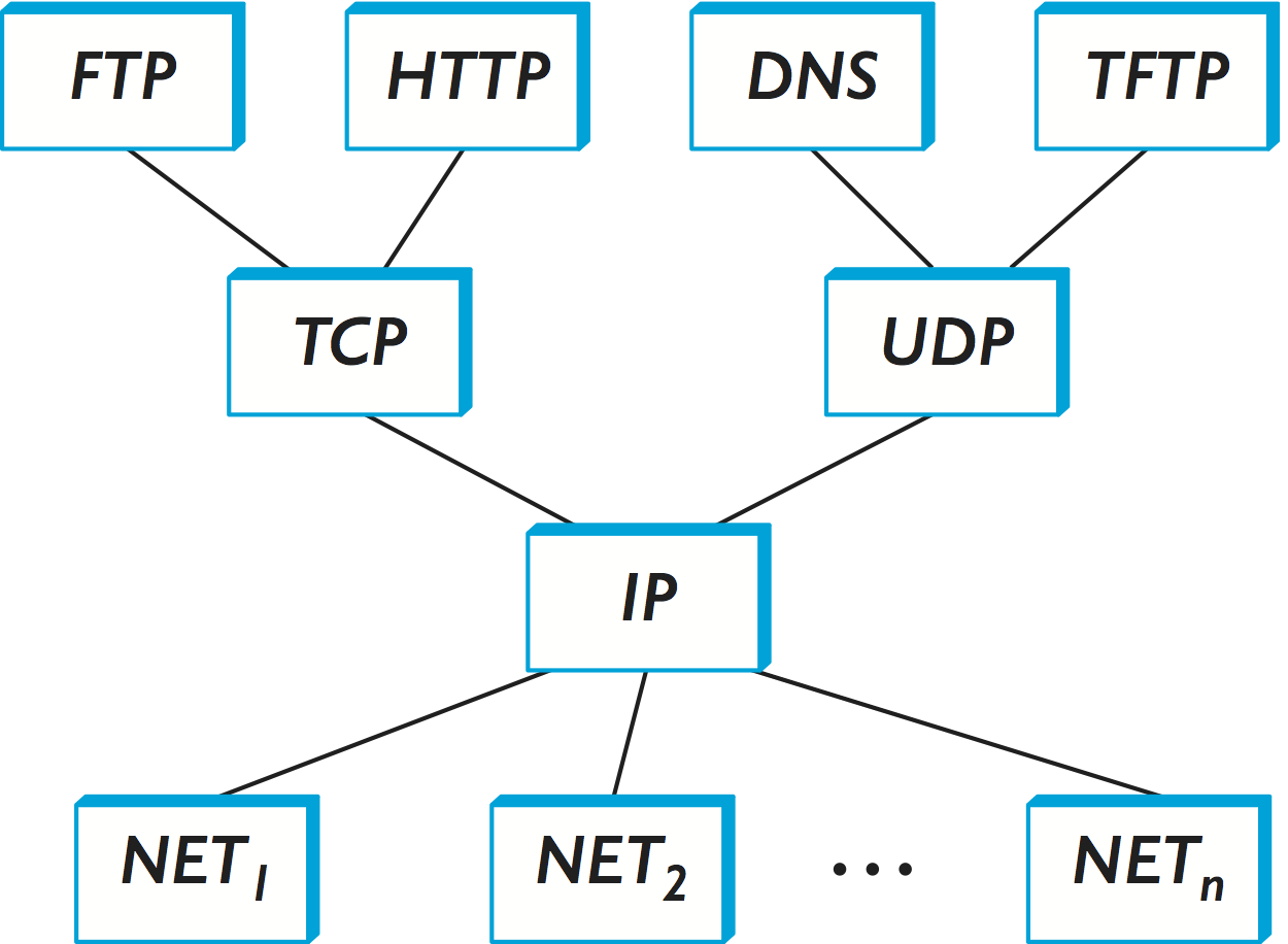 While the 7-layer OSI model can, with some imagination, be applied to the Internet, a simpler stack is often used instead. At the lowest level is a wide variety of network protocols, denoted NET1, NET2, and so on. In practice, these protocols are implemented by a combination of hardware (e.g., a network adaptor) and software (e.g., a network device driver). For example, you might find Ethernet or wireless protocols (such as the 802.11 Wi-Fi standards) at this layer. (These protocols in turn may actually involve several sublayers, but the Internet architecture does not presume anything about them.) The next layer consists of a single protocol—the Internet Protocol (IP). This is the protocol that supports the interconnection of multiple networking technologies into a single, logical internetwork. The layer on top of IP contains two main protocols—the Transmission Control Protocol (TCP) and the User Datagram Protocol (UDP). TCP and UDP provide alternative logical channels to application programs: TCP provides a reliable byte-stream channel, and UDP provides an unreliable datagram delivery channel (datagram may be thought of as a synonym for message). In the language of the Internet, TCP and UDP are sometimes called end-to-end protocols, although it is equally correct to refer to them as transport protocols.