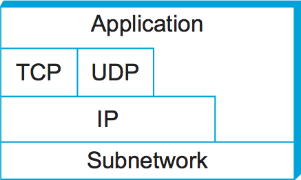 Figure 15. Alternative view of the Internet architecture. The “subnetwork” layer was historically referred to as the “network” layer and is now often referred to as “Layer 2” (influenced by the OSI model).#