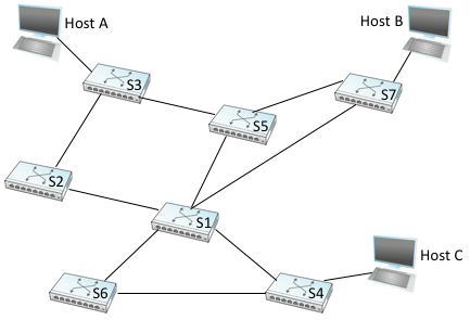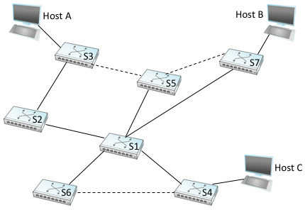 In our example switched network, suppose that a packet enters switch S4 from Host C and that the destination address is one not yet in any switch’s forwarding table: S4 sends a copy of the packet out its two other ports: to switches S1 and S6. Switch S6 forwards the packet onto S1 (and meanwhile, S1 forwards the packet onto S6), both of which in turn forward their packets back to S4. Switch S4 still doesn’t have this destination in its table, so it forwards the packet out its two other ports. There is nothing to stop this cycle from repeating endlessly, with packets looping in both directions among S1, S4, and S6.