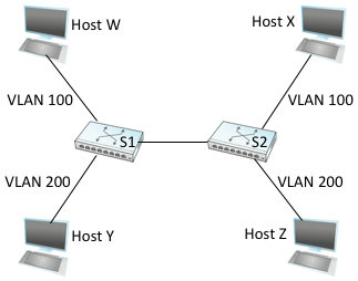 When a packet sent by host X arrives at switch S2, the switch observes that it came in a port that was configured as being in VLAN 100. It inserts a VLAN header between the Ethernet header and its payload. The interesting part of the VLAN header is the VLAN ID; in this case, that ID is set to 100. The switch now applies its normal rules for forwarding to the packet, with the extra restriction that the packet may not be sent out an interface that is not part of VLAN 100. Thus, under no circumstances will the packet—even a broadcast packet—be sent out the interface to host Z, which is in VLAN 200. The packet, however, is forwarded on to switch S1, which follows the same rules and thus may forward the packet to host W but not to host Y.