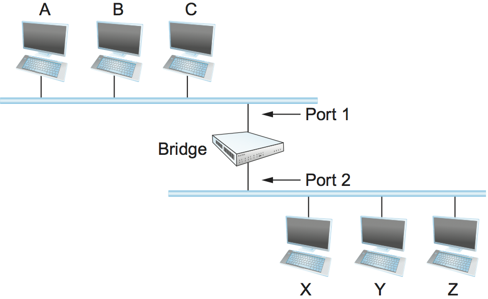 The following starts with the historical perspective (using bridges to connect a set of Ethernet segments), and then shifts to the perspective in wide-spread use today (using L2 switches to connect a set of point-to-point links). But whether we call the device a bridge or a switch—and the network you build an extended LAN or a switched Ethernet—the two behave in exactly the same way.