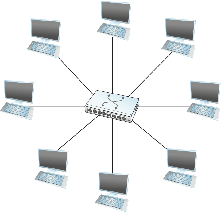 In the simplest terms, a switch is a mechanism that allows us to interconnect links to form a larger network. A switch is a multi-input, multi-output device that transfers packets from an input to one or more outputs. Thus, a switch adds the star topology (see Figure 56) to the set of possible network structures. A star topology has several attractive properties: