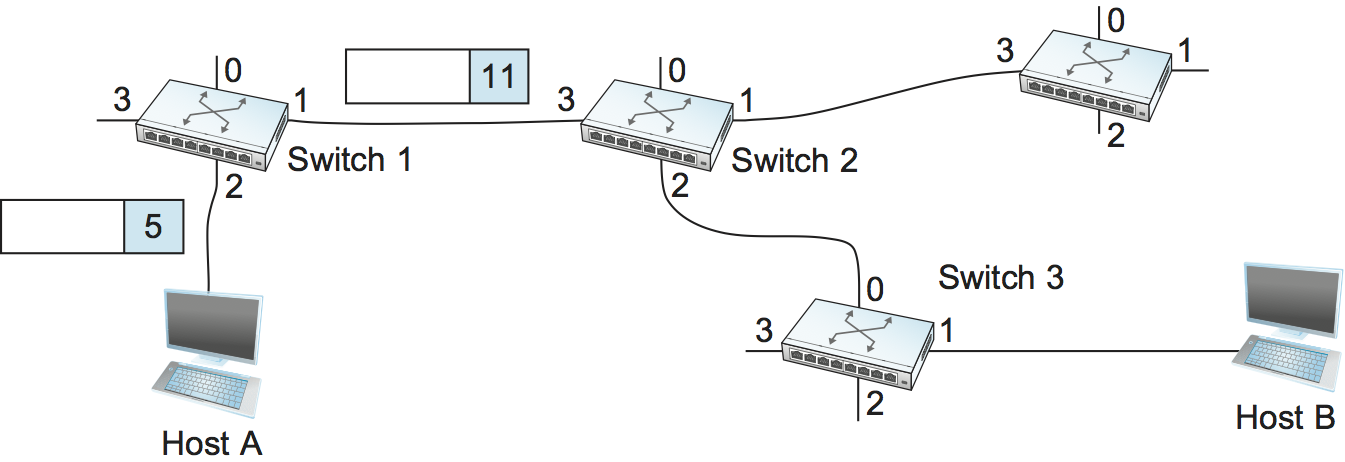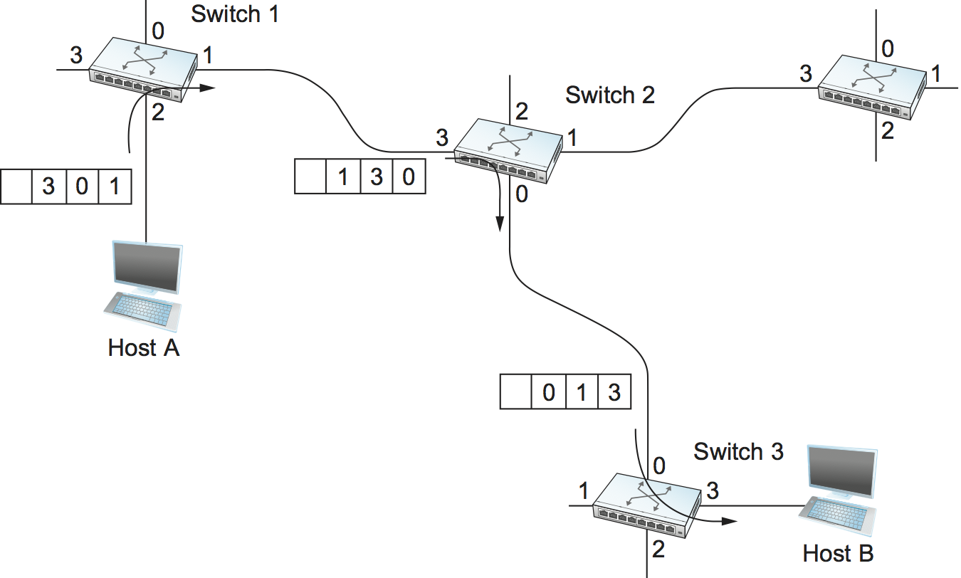 In this example, the packet needs to traverse three switches to get from host A to host B. At switch 1, it needs to exit on port 1, at the next switch it needs to exit at port 0, and at the third switch it needs to exit at port 3. Thus, the original header when the packet leaves host A contains the list of ports (3, 0, 1), where we assume that each switch reads the rightmost element of the list. To make sure that the next switch gets the appropriate information, each switch rotates the list after it has read its own entry. Thus, the packet header as it leaves switch 1 en route to switch 2 is now (1, 3, 0); switch 2 performs another rotation and sends out a packet with (0, 1, 3) in the header. Although not shown, switch 3 performs yet another rotation, restoring the header to what it was when host A sent it.