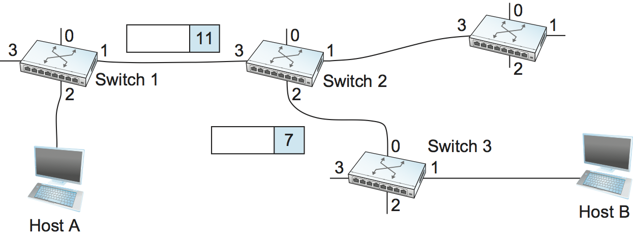 Now, to complete the connection, everyone needs to be told what their downstream neighbor is using as the VCI for this connection. Host B sends an acknowledgment of the connection setup to switch 3 and includes in that message the VCI that it chose (4). Now switch 3 can complete the virtual circuit table entry for this connection, since it knows the outgoing value must be 4. Switch 3 sends the acknowledgment on to switch 2, specifying a VCI of 7. Switch 2 sends the message on to switch 1, specifying a VCI of 11. Finally, switch 1 passes the acknowledgment on to host A, telling it to use the VCI of 5 for this connection.