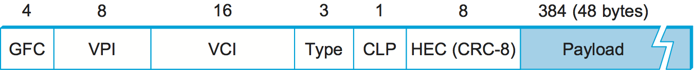 The approach ATM takes has some interesting properties, which makes it worth examining a bit further. The picture of the ATM packet format—more commonly called an ATM cell—in Figure 61 will illustrate the main points. We’ll skip the generic flow control (GFC) bits, which never saw much use, and start with the 24 bits that are labelled VPI (virtual path identifier—8 bits) and VCI (virtual circuit identifier—16 bits). If you consider these bits together as a single 24-bit field, they correspond to the virtual circuit identifier introduced above. The reason for breaking the field into two parts was to allow for a level of hierarchy: All the circuits with the same VPI could, in some cases, be treated as a group (a virtual path) and could all be switched together looking only at the VPI, simplifying the work of a switch that could ignore all the VCI bits and reducing the size of the VC table considerably.