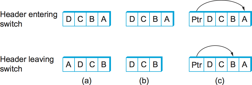 Figure 63. Three ways to handle headers for source routing: (a) rotation; (b) stripping; (c) pointer. The labels are read right to left.#