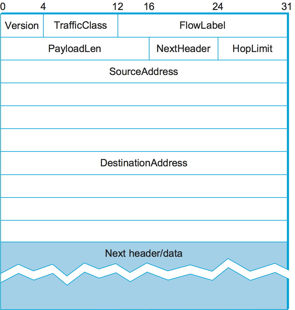 Despite the fact that IPv6 extends IPv4 in several ways, its header format is actually simpler. This simplicity is due to a concerted effort to remove unnecessary functionality from the protocol. Figure 108 shows the result.