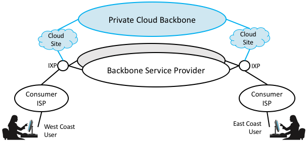 There are two consequences to this wide dispersion of the cloud. One is that the end-to-end path from client to server doesn’t necessarily traverse the entire Internet. A user is likely to find the content he or she wants to access has been replicated at a nearby IXP—which is usually just one AS hop away—as opposed to being on the far side of the globe. The second consequence is that the major cloud providers do not use the public Internet to interconnect their distributed datacenters. It is common for cloud providers to keep their content synchronized across distributed datacenters, but they typically do this over a private backbone. This allows them to take advantage of whatever optimizations they want without needing to fully inter-operate with anyone else.