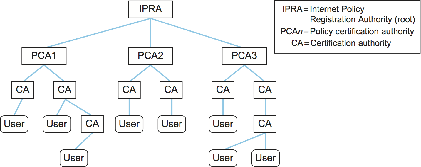 Establishing keys out of band doesn’t sound like it would scale well, but it suffices to bootstrap a PKI. Bob’s knowledge that Alice’s key is x can be widely, scalably disseminated using a combination of digital signatures and a concept of trust. For example, suppose that you have received Bob’s public key out of band and that you know enough about Bob to trust him on matters of keys and identities. Then Bob could send you a message asserting that Alice’s key is x and—since you already know Bob’s public key—you could authenticate the message as having come from Bob. (Remember that to digitally sign the statement Bob would append a cryptographic hash of it that has been encrypted using his private key.) Since you trust Bob to tell the truth, you would now know that Alice’s key is x, even though you had never met her or exchanged a single message with her. Using digital signatures, Bob wouldn’t even have to send you a message; he could simply create and publish a digitally signed statement that Alice’s key is x. Such a digitally signed statement of a public key binding is called a public key certificate, or simply a certificate. Bob could send Alice a copy of the certificate, or post it on a website. If and when someone needs to verify Alice’s public key, they could do so by getting a copy of the certificate, perhaps directly from Alice—as long as they trust Bob and know his public key. You can see how starting from a very small number of keys (in this case, just Bob’s) you could build up a large set of trusted keys over time. Bob in this case is playing the role often referred to as a certification authority (CA), and much of today’s Internet security depends on CAs. VeriSign is one well-known commercial CA. We return to this topic below.