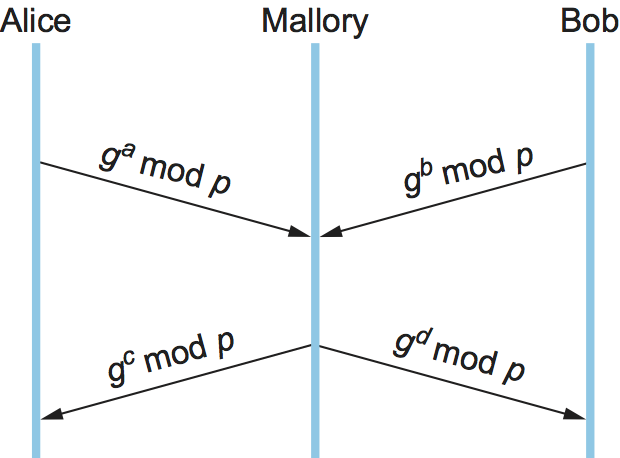 There is the problem of Diffie-Hellman’s lack of authentication. One attack that can take advantage of this is the man-in-the-middle attack. Suppose Mallory is an adversary with the ability to intercept messages. Mallory already knows p and g since they are public, and she generates random private values \(c\) and \(d\) to use with Alice and Bob, respectively. When Alice and Bob send their public values to each other, Mallory intercepts them and sends her own public values, as in Figure 201. The result is that Alice and Bob each end up unknowingly sharing a key with Mallory instead of each other.